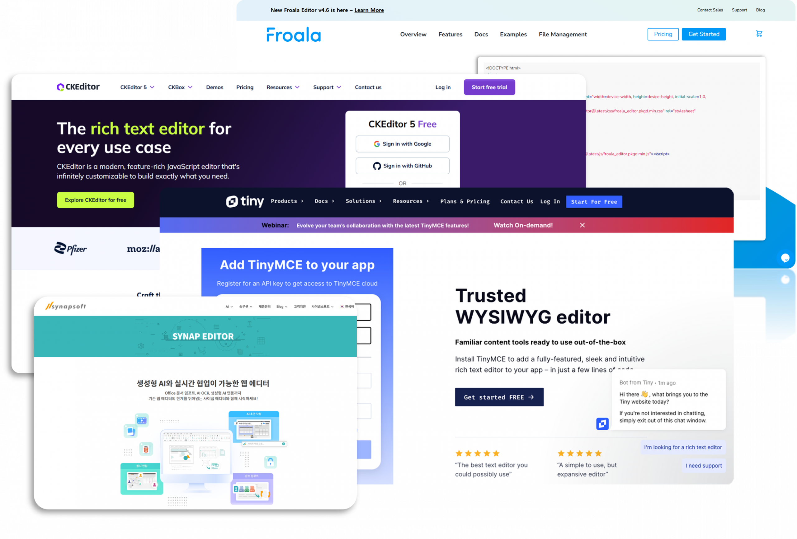 Froala Editor는 5% 점유율의 3위이지만 ‘Small but Strong’ 전략으로 주목받고 있습니다. 53,600개 기업이 채택했으며, API 통합 중심의 B2B SaaS 전략으로 엔터프라이즈 시장 공략에 집중하고 있습니다.