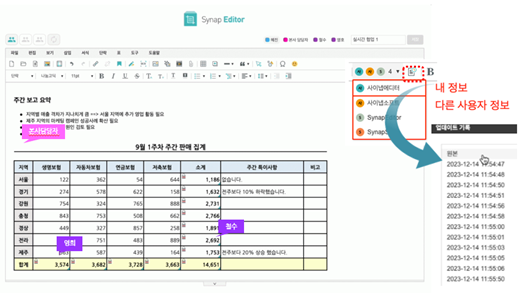 국내 에디터 중 유일하게 사이냅 에디터가 실시간 협업 기능을 지원하고 있습니다. 글로벌 에디터의 필수 기능을 완벽하게 구현하여 협업 중심의 글로벌 업무 환경 트렌드에 부합하는 서비스를 제공하며 글로벌 경쟁력을 확보하고 있습니다.