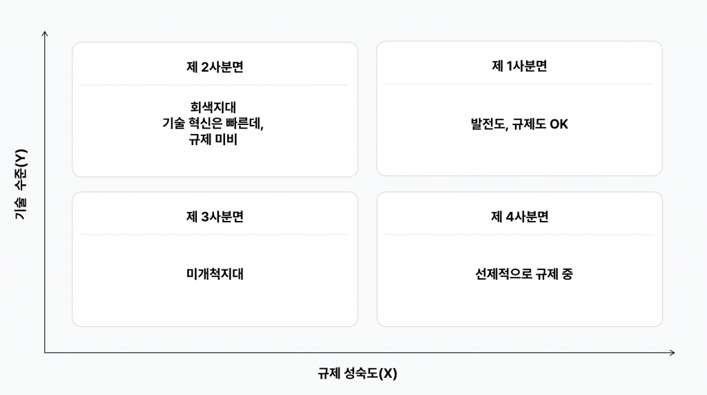 산업 기술과 정부 정책의 상호작용을 분석하기 위해 전통적으로 사용되는 4분면(2×2) 모델이 있습니다. 기술–정책 대응 매트릭스’ 라고 불리는 틀인데요. 기술의 ‘산업화 수준‘과 ‘정부 규제의 성숙도‘를 두 축으로 설정하여 분석합니다.