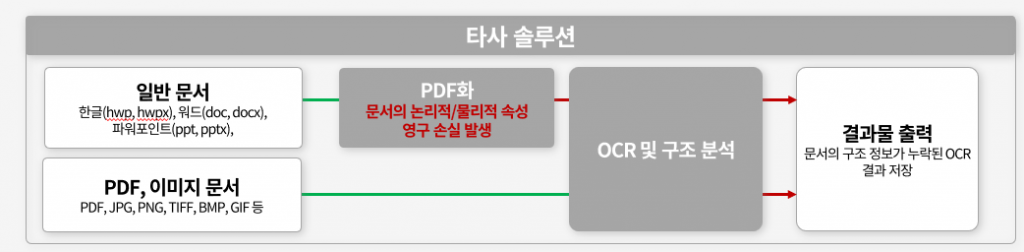 PDF는 인쇄를 위한 ‘페이지 기술 언어’일 뿐, 문서의 논리적 구조 정보를 담고 있지 않습니다. 원본 문서가 가지고 있던 다음과 같은 중요한 정보들이 영구적으로 손실됩니다: