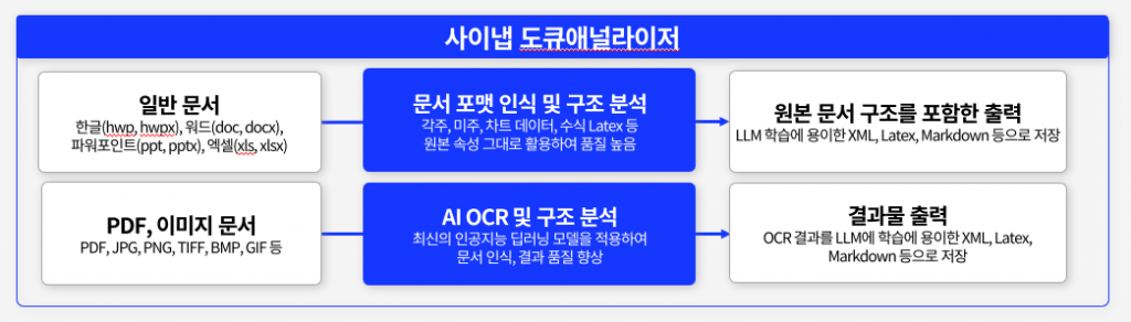 AI OCR엔진으로 분석할 뿐만 아니라 한글, 워드, 파워포인트, 엑셀 등의 문서는 사이냅만의 원본문서 구조 분석을 하는 엔진을 사용해 복합적으로 분석합니다.