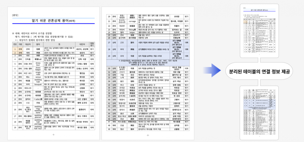 사이냅 도큐애널라이저는 한글, 워드 문서에서 페이지가 분리되어있지만 실은 1개인 표의 연결 정보를 제공합니다.