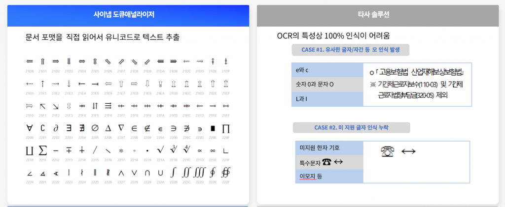 반면 HWP, DOCX, PPTX 파일 내부에는 모든 텍스트가 유니코드로 저장되어 있습니다. 사이냅 도큐애널라이저는 파일 포맷을 직접 파싱하기 때문에 이 유니코드 문자를 그대로 추출합니다. 추정이나 인식 과정이 없으므로 특수문자, 한자, 수식 기호 모두 100% 정확하게 가져올 수 있습니다.