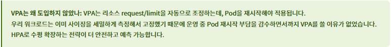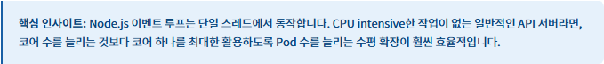 다만 동시에 CPU-intensive 작업이 몰리는 스파이크 상황에서는 코어 여유분이 없으므로 HPA를 통한 수평 확장이 더욱 중요해집니다