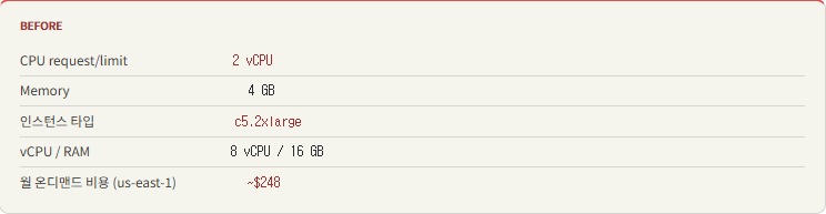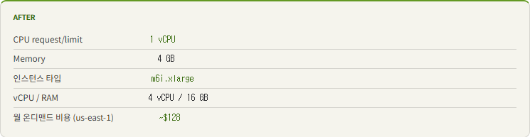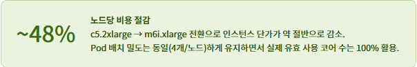 컴퓨팅 최적화(c5)에서 범용 인스턴스(m6i)로 전환하여 CPU와 메모리 할당 비율을 1:4로 맞춤. Pod 배치 밀도를 최적화하여 빈 자원(Slack Resource) 없이 노드 수용량을 100% 활용, 결과적으로 노드당 비용 약 48% 절감 -