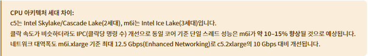 c5 시리즈는 컴퓨팅 최적화 인스턴스입니다. CPU:메모리 비율이 높지만, 우리 워크로드처럼 코어 1개 + 메모리 4 GB 단위로 Pod을 배치하면 CPU 자원이 남아돌아 메모리가 먼저 포화됩니다.
