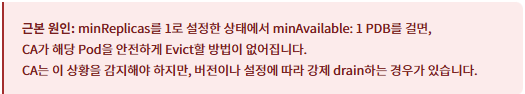 replica가 1개일 때 minAvailable: 1이면, CA 입장에서는 이 Pod을 어디에도 옮길 수 없습니다.